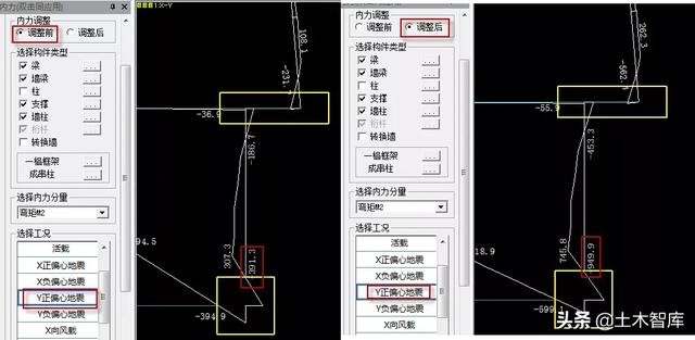 Y向正偏心地震作用下,该转换梁有三个调整系数,综合调整系数为:1.25*1.21*1.6=2.42,因此,按照这个调整系数计算调整后内力为:2.42*391.13=946.53kNm。