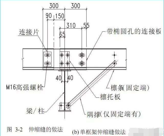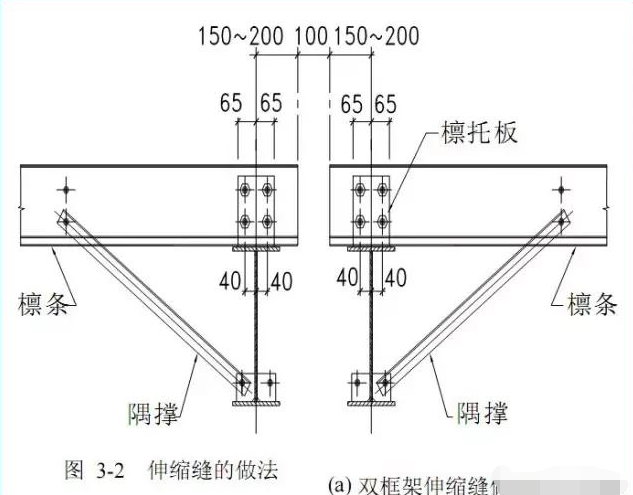 根据轻钢规程,最大纵向长度不大于300m,横向不应大于150m。纵向温度区段的伸缩缝设置可采用双柱布置(图3-2a),或者将檩条连接采用椭圆孔的单柱伸缩缝(图3-2b)。