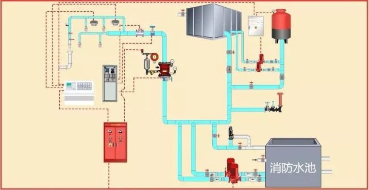 1、消防水池、消防水泵、水泵接合器、消防水箱(参见消火栓系统)。用气压罐代替高位消防水箱,消防水箱的出水管未与报警阀前的管道连接。