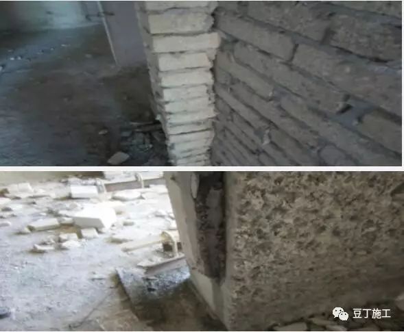 门边短垛墙采用水泥砖组砌,无咬砌,短垛混凝土无植筋,抗裂性能差。