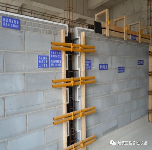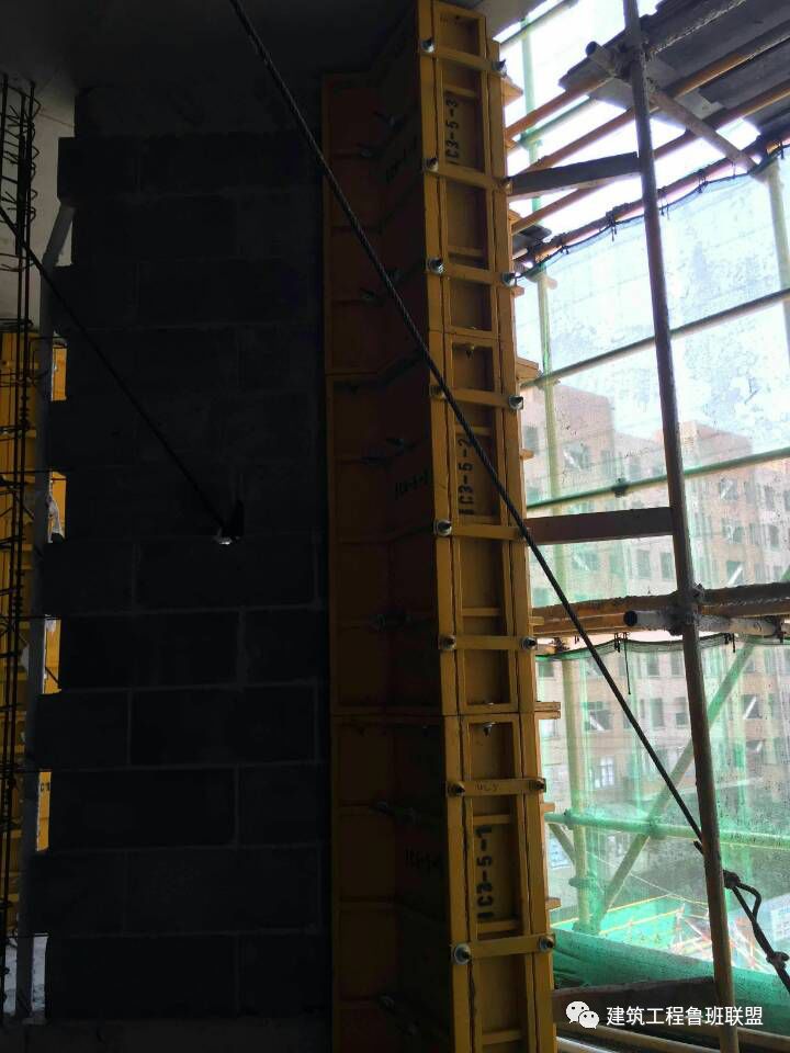 5、支设构造柱模板时,采用对拉螺栓式夹具,为了防止模板与砖墙接缝处漏浆,用双面胶条粘结。