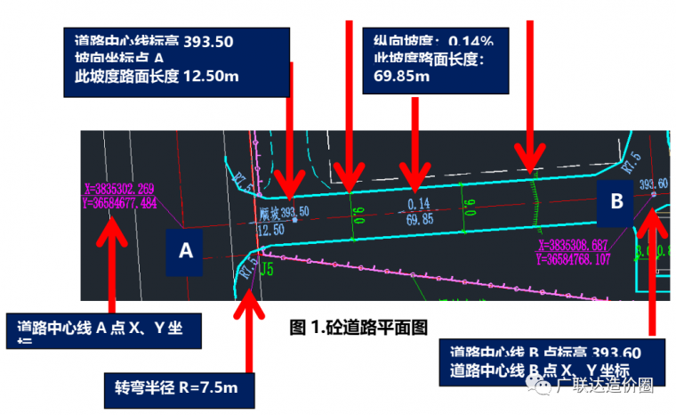 图1所示道路平面图上,有效信息包括:路面宽度、路面长度、路面坡度、道路中心标高、道路转弯半径等,这些信息在后面计算工程量时都需要用到。