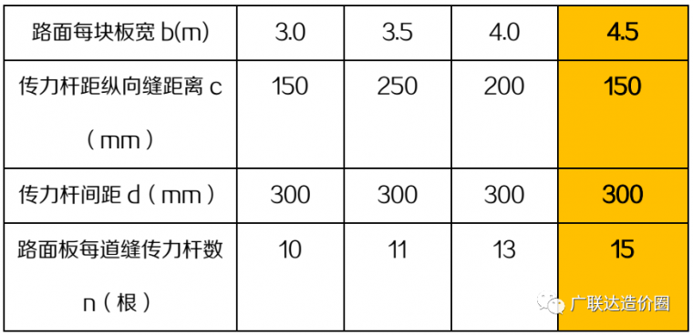 每道缝传力杆数量=4.2/d+1=4.2/0.3+1=15根,详见表1刷黄色列。