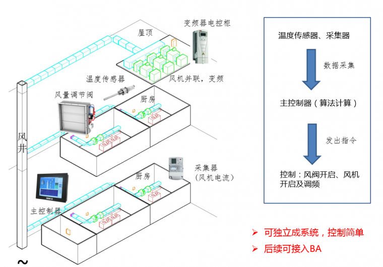 项目B:地上三层,一层有肯德基等快餐,三层餐饮,地下一层有增加的餐饮业态;应用2套智能化主控系统,控制集中排油烟系统主风机共10台,风机功率共215kW。
