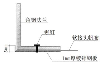 (4)帆布与法兰的压边:压条宜采用1.0mm厚的镀锌钢板,压条及帆布在法兰连接端翻边5mm,采用铆钉固定,铆钉间距100mm为宜。