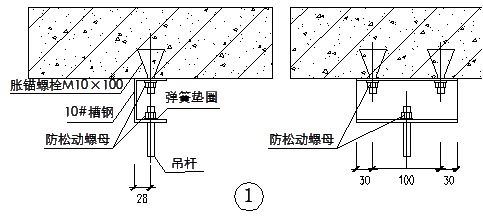 (2)吊架与楼板间采用10号槽钢连接,每个槽钢用两个M10100胀锚螺栓固定在楼板下,胀锚螺栓间距不小于100mm。