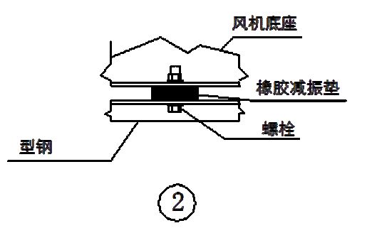 (3)选择设计型号对应的减振器,将减振器与吊杆连接。如设计不采用减振器时,在风机底座与吊装的型钢间垫上橡胶减振垫(厚度按照风机厂商技术要求选择)。