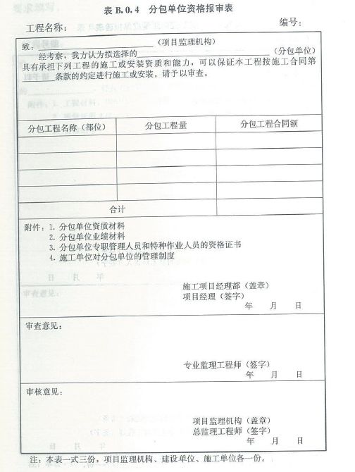 分包单位资格报审表应在分包工程开工前,由施工单位报送项目监理机构,由总监理工程师组织专业监理工程师审核,专业监理工程师提出审查意见后,由总监理工程师审核签认。主要审查以下4点: