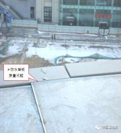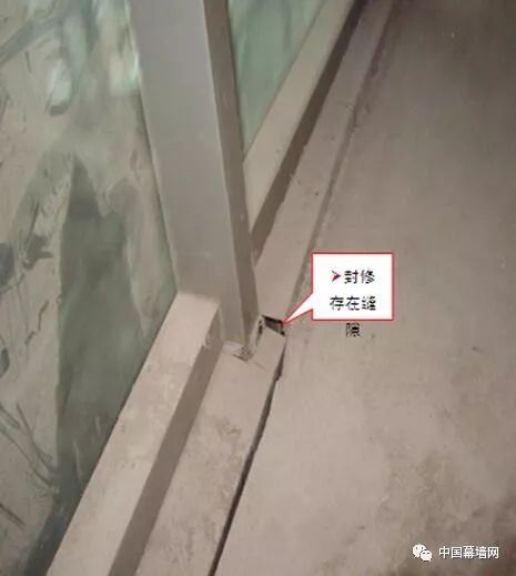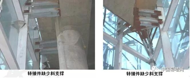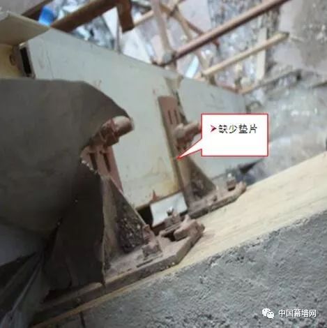 3、安装管理不到位,安装质量不合格。(层间封修质量不好,竖框伸缩缝处没有打胶,竖框和横框间没有打胶,转接件与竖框间缺失垫片或安装有缝隙,玻璃与框间缺失垫块、石材幕墙缺失垫片等。
