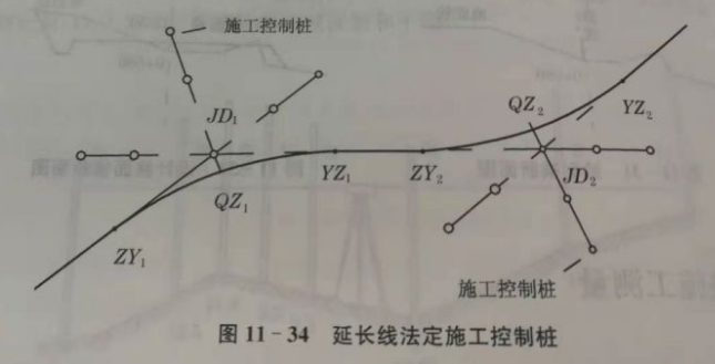 延长线法是在路线转折处的中线延长线上以及曲线中点至交点的延长线上测设施工控制桩,如图11-34所示。控制桩至交点的距离应量出并做记录。