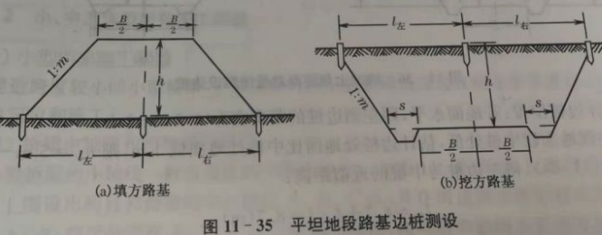 如图11-36(a)所示,在坡地上测设路基边桩,从图上可以看出,左、右边桩离中桩的距离为