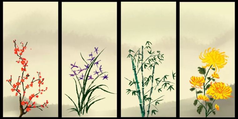看似简单的植物材料也蕴含着深层次的内涵,比如古人将花卉人格化,于是就有了梅花清标韵高,竹子节格刚直,兰花幽谷品逸,菊花操介清逸,并喻为四君子。