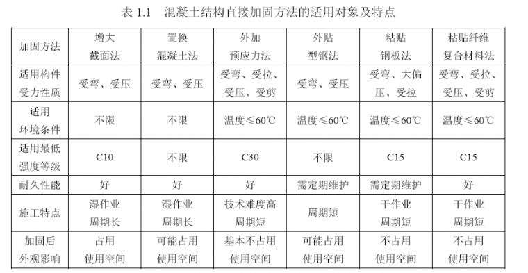 包括增大截面法、外包纤维材料加固法、置换混凝土加固法、外包钢加固法、施加预应力加固法以及增加辅助结构等其他加固方法。通过上述方法直接提高结构的承载能力、改善使用性能并延长使用寿命。