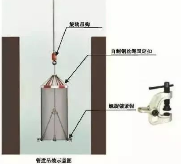 2. 吊运竖向管道时,应编制专项施工方案,在管道不能焊置吊耳的情况下,可采用下图所示的吊装方式。
