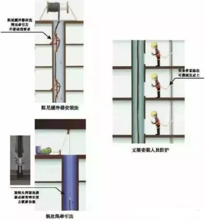 5. 阻尼缓冲器法:采用阻尼缓冲器制约重力加速度, 把电缆由上往下垂直敷设,滑轮缓冲器在安装前应进行阻尼试验。