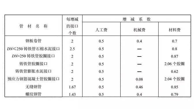 根据上式计算的接口增减数量,按下表规定,以每10m管道安装相应定额的人工、材料、机械费乘以表中相应系数,作为增减的人工、材料、机械费: