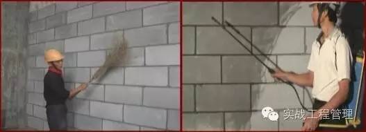 (1)基层浮灰、松散砂浆或砼块、紧贴在结构面上拉脱的模板表皮清理干净, 否则造成抹灰砂浆无法与基层粘结牢固而出现空鼓。
