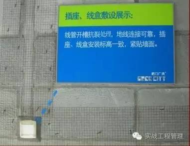 线管开槽用砂浆封堵,砂浆要饱满密实,并沿槽挂铁丝网,插座、线盒安装 高度要一致,紧贴墙面。