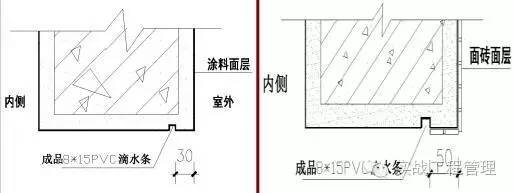 (1)滴水线或槽这个是细部作法,应确保顺直和坡度一致。有成品和贴面砖 等等作法。