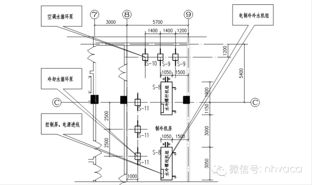 图1为电制冷水冷式冷水机组的图面示意,一般来说,在图纸上设备以方框表示,图中的电制冷水冷式冷水机组为水冷螺杆式冷水机组,我们可以看到主要的接管有空调水接管、冷却水接管,均为一进一出,旁边的空调水循环泵、冷却水循环泵则与空调主机配套形成完整的制冷循环过程。设备接管位置需要留出安装检修空间。而设备控制屏和电源进线位置则需要留出操作空间。设备的参数等要求应由图纸的设备表查出。