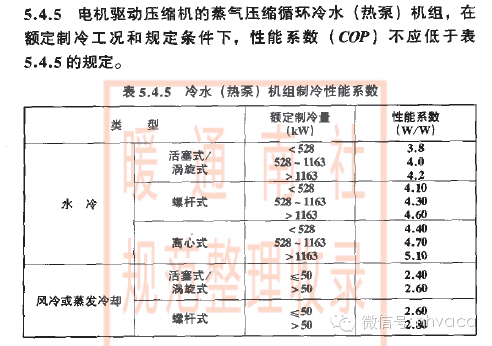 性能系数(COP)又被称为能效比,是在规定条件下制冷机的制冷量与其净输入能量之比。水冷冷水机组的COP值较高,一般在4~6,其中水冷离心机组COP值一般为5~6,水冷螺杆机组的COP值一般为4.4~5.2,水冷活塞机组或水冷涡旋机组的COP值一般为4~5。风冷热泵机组的COP值一般为3左右。GB 50189-2005 公共建筑节能设计标准: