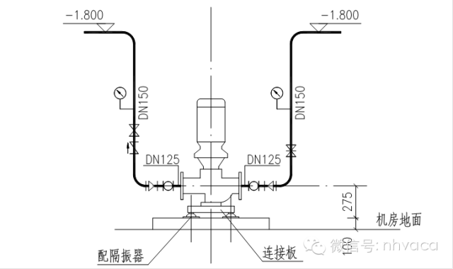 图3为水泵接管的图面示意,图中表示的为立式离心泵,进水管设有闸阀、变径管、软接头,出水管设有软接头、变径管、止回阀和球阀。进出水管上设置的压力表是为了在运行中了解水泵的实际运行参数。我们可以注意到,在设备的进出口接管段设有软接头,设备与基础的连接设有隔振器,这些是为了避免水泵运行的振动通过基础和管道传递出去。