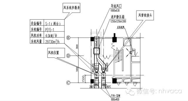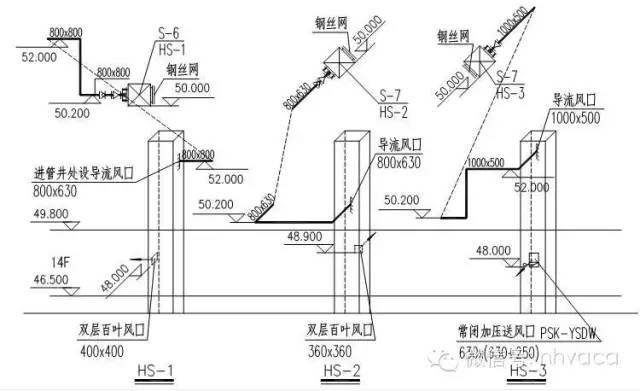 在竖风道图中可以明了地看出各加压送风系统的送风口标高、尺寸,出于完整表达系统的需要,还将加压送风机的安装标高、送风管管径及安装标高等绘制在图纸上,将竖风道图与相应的风管平面图对照观看可以迅速了解整个系统的基本情况。