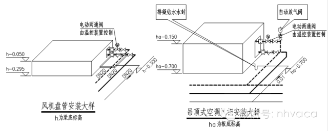 图5为末端设备的接管示意图,风机盘管与吊顶式风柜的水管接管均有三个接口,分别是供水管、回水管和凝结水管,考虑设备振动的因素,接口处均设置软接头。一般来说考虑排出设备内热交换盘管的空气气的因素,回水管在上,供水管在下,凝结水管为自流排水,因此在设备底部接管。两者也有不同之处,由于吊顶式风柜的处理风量大、风压高,设备的尺寸要比风机盘管大,一般要利用梁内空间安装,因此吊顶式风柜的回水管上需要设置自动放气阀,而风机盘管除了在设备本体设置手动放气阀外,一般可以在梁下安装,利用回水管将盘管内空气带出。在凝结水的接管处理上,风机盘管的凝结水盘是露在外部的,因而直接接管即可,吊顶式风柜因为凝结水盘在设备内部,运行时设备内部存在负压,凝结水管需要设置水封,以利于稳定地排出凝结水,在这个环节上吊顶式风柜与组合式空调机组是相同的。
