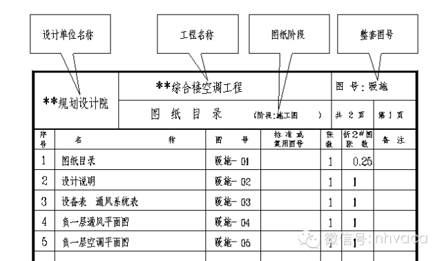 (3) 图纸目录内容大致都会体现:设计单位、建设单位、项目名称、图纸阶段(方案、初步设计、施工图等)、整套图号、页数、序号、名称、单张图号、标准或复用图号、折2#图张数、备注、制表、校核、审核等内容,上述内容编制的顺序会有所差别,不过一般都会按照:说明平面图系统、原理图大样、详图的基本顺序进行编排;(与给排水工程施工图目录相同)。
