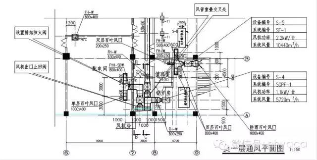 风管平面图中,风机房、风井部位需要给予关注,因为风井还牵涉到上下楼层的平面,而风机房部位则由于风机的安装往往存在比较复杂的空间关系。本图中防火阀的类型较多,有常开防火阀、常开排烟防火阀,为表达清楚分别设置了不同的阀门代号,如FH-W表示常开防火阀,边上的70℃表示防火阀的动作温度;FYH-SDW表示常开排烟防火阀,边上的280℃表示防火阀的动作温度。防火阀其余的要求可以通过材料表查询。在风管平面图中,识图的目的是了解通风系统的组成和管线走向、风井的位置、管径大小、设备的位置、相关阀门管件的位置等。