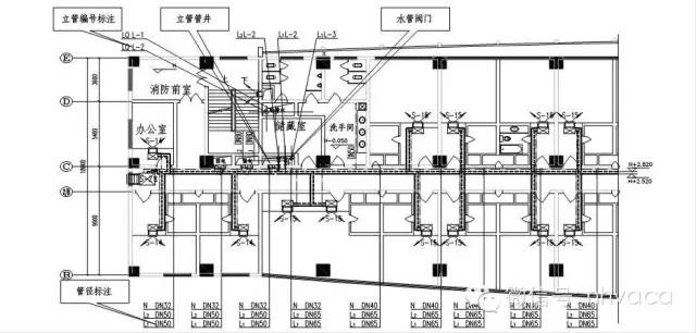 在水管平面图中,水系统立管位置应引起重视,因为立管是起着连接各层空调水管的作用,理清立管也就理清了空调水系统的主要管线。