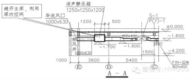 图17是暖施-04中的A-A剖面,在这里应该强调一下,它主要表现了车库排风兼排烟系统P(Y)-1由风机排入排风井之间管道的竖向关系,由图中可以看到消声静压箱高度较高,因此其位置错开结构主梁位置,利用了部分梁内空间安装。表达管道设备与结构梁、板的相对关系是剖面图在图面表达上的特点