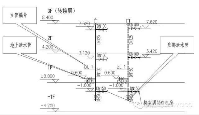 空调冷热水管路采用竖向输送时可通过绘制立管系统图并给立管编号,注明立管管径、接口标高,在立管系统图上还可以表达管道伸缩器、固定支架位置等。