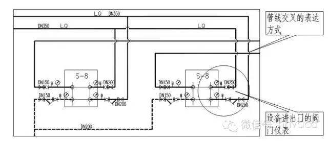 图20中表示了制冷主机进出水管设置的阀门仪表,包括空调冷却水管和空调冷冻水管,为了识图的方便和不引起误解,不同类型管线交叉的地方用圆弧线绕过。图中在设备进出口均设置了温度计和压力表,表示经过制冷主机S-8后,介质的压力、温度发生了变化,需要进行监控。