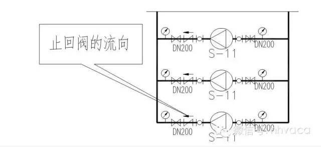 泵组在流程图中是比较重要的,它是流体输送的动力,图21是流程图中的冷却水泵泵组,我们可以注意到水泵进出口设置的阀门管件,压力表的设置表明水泵进出口压力的变化,而止回阀上面介质的流向则表明整个系统中介质按此方向流动,而每台泵接管管径的标注也弥补了平面图中管径无法逐段标注的遗憾。