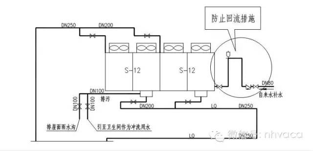 图22为流程图中的冷却塔(S-12)接管,应该注意道除空调循环冷却水的进水和出水外,由于水分的不断蒸发和排污的需要,不仅有排污管还需要有新水补入管,排污水管除直接排屋面雨水沟外还考虑引至卫生间作为冲洗用水,这是提示冷却水的排污水可以综合利用,提高用水效率,节约水资源。在自来水补水管段上设置的止回阀、上弯管段和放气阀组成一个防止回流的安全装置,可以确保在止回阀失效的情况下冷却塔底盘的水也不会回流污染自来水。