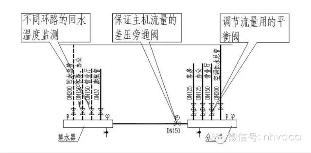 图23是流程图中分、集水器接管部分。流程图中的分、集水器部分体现了空调水系统根据建筑功能设置的空调供回水环路,考虑到随室外气象参数的变化,不同功能建筑房间的空调负荷变化是不一样的,在回水管上设置温度计可以对不同环路的负荷情况有一个基本的判断,并依据此判断调节分水器上供水环路的平衡阀使其流量分配能适应负荷的变化。在分集水器之间的联通管上设置差压旁通阀是为了保证主机的流量出于稳定运行的区间,因为在末端设备的电动两通阀大多关闭时,空调水系统的阻力增加很多,流量下降较大,而此时差压旁通阀根据压差动作使得分水器内的空调冷冻水直接回流到水泵和主机,保证了主机的流量。