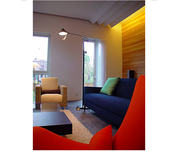 至于客厅中红、黄、蓝、黑的构成,更是带有几何抽象风格。我们看见,粗重的黑色线条控制着几个大小不同的矩形,形成非常简洁的结构。而视觉的主导又是那鲜亮的红色沙发,虽然面积不大,但色度极为饱和。同时,主沙发的蓝色、墙面的一黄色与地毯的灰白色有效配合,牢牢控制住红色沙发在整个空间上的平衡。