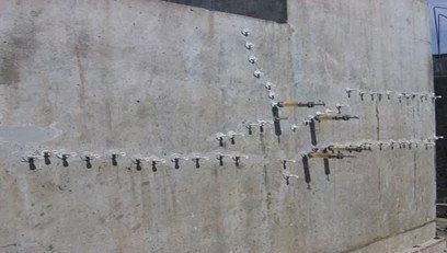 此法应用范围广,从细微裂缝到大裂缝均可适用,处理效果好。利用压送设备(压力0.2~0.4MPa)将补缝浆液注入砼裂隙,达到闭塞的目的,该方法属传统方法,效果很好。也可利用弹性补缝器将注缝胶注入裂缝,不用电力,十分方便效果也很理想。