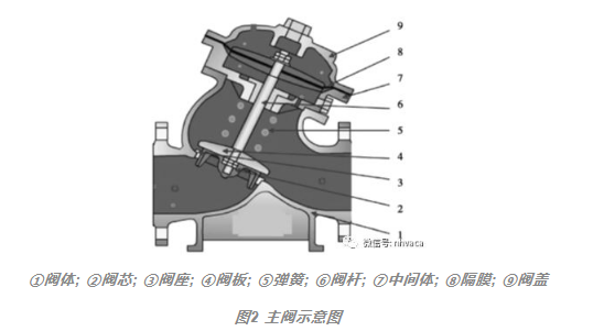 主阀的典型结构见图2。图2中的主阀为隔膜双腔型,是由阀体、阀芯、阀座、阀板、弹簧、阀杆、中间体、膜片、阀盖等主要零部件组成。