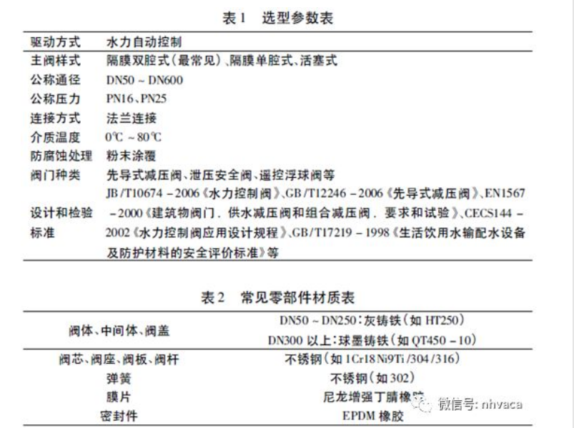 1) 水力控制阀的选型主要为主阀的选型,包括样式、口径、压力、材质等。常见的水力控制阀选型参数见表: