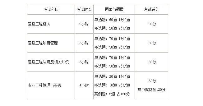 考试科目有《建设工程经济》、《建设工程项目管理》、《建设工程法规及相关知识》和《专业工程管理与实务》。前三科以客观题为主,后面则是涉及主观题,每门科目相对独立,理论知识广泛,更注重理解和记忆。