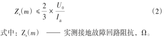式(1)与IEC 60364 - 4 - 41:2017《 Lowvoltage electrical installationsPart 4-41:Protection for safetyProtection against electric shock》中是一致的,U0和Ia都容易获取,难点是Zs的计算。GB 50303 - 2015《建筑电气工程施工质量验收规范》第5.1.8条,对接地故障回路阻抗的实测值要求满足式(2),并要求对20 % 的末级配电箱至少抽查1个回路: