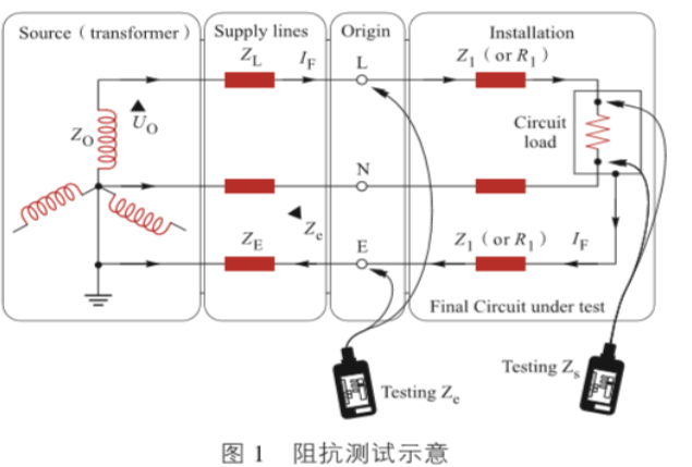 图1是《 A Practical Guide to the Wiring Regulations 》中阻抗测试示意。阻抗测试可用多功能电气测试仪带电测试,但仪器本身也有测量范围和一定的误差,现场线路绕行、接头、参数取值差异、测试误差等因素可能导致计算满足但测试不满足的情况。