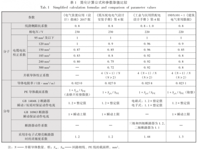 通用法源于IEC 61200 - 53:1994《Electrical installation guidePart 53:Selection and erection of electrical equipmentSwitchgear and controlgear》提出的一种工程应用简化和校验办法的实用公式。目前的专业书籍、手册和图集的相关计算公式看起来大同小异,也是因为它们的思路均是源于此公式。现在应用比较多的几个简化计算公式主要来自于施耐德《电气装置应用(设计)指南》2017版(以下简称文献[1])、ABB《低压配电电气设计安装手册》(第4版,以下简称文献[2])、《工业与民用供配电设计手册》(第4版,以下简称文献[3])和国标图集19DX101 - 1(以下简称文献[4]),由于不同资料中同类参数的字母表达不一致和篇幅关系,表1按实际参数在分子、分母的位置和大概的作用进行比较。