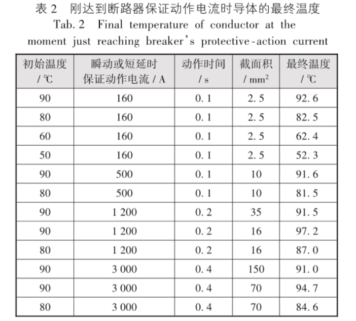 将几种常规的断路器和电缆组合参数代入公式(3),得到表2。