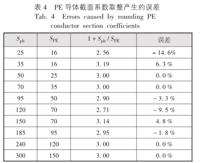 表9综合误差分析未考虑PE导体截面系数和电缆电抗校正系数在特定截面的误差部分抵消,从结果看:文献[2]和文献[3]均无正方向误差;文献[1]和文献[4]均有正方向误差。如不改变其他取值的情况下,将灵敏度系数分别调整为1.5、1.2、1.3、1.4,则4种方法的综合误差均无正方向误差,从安全角度考虑是可用的。但如果一定要达到GB 50303 - 2015的要求,上述灵敏度系数还需进一步加大。灵敏度系数和计算方法、参数取值、计算目标相关,单独谈灵敏度系数没有意义,在IEC和BS标准中也并没有灵敏度1.3的说法。