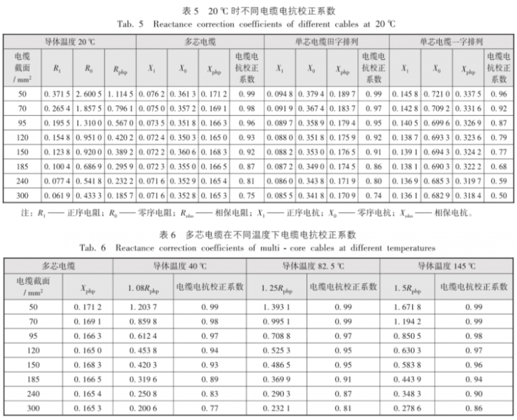 电缆电抗校正系数出现的原因主要是因为通用法的简化计算公式中只反映了电阻,没有反映电抗,从数值上看,就是电阻和阻抗的比值。对于同一截面的导体,电抗值和导体排布有关,电阻值和导体温度有关。下面取文献[3]中电缆参数进行复核,如表5~表7所示。