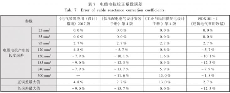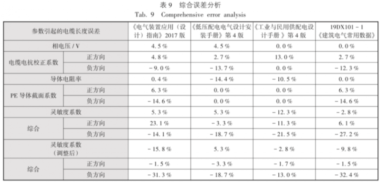简化计算公式和相应表格的目的是减轻工作量,但肯定会产生一些误差,在应用时要知道误差的范围。如果表格最大允许长度的误差是0~- 30 %,查表结果是100 m,当实际长度100 m时是满足的,实际长度 > 142 m时是不满足的,而100 m < 实际长度142 m是否满足需要用更准确的方法复核。误差范围越小,需要复核的可能性就越低,复核工作量就越少。从表9可以看出,文献[3]只要将电缆电抗校正系数优化,综合误差就基本没有了。