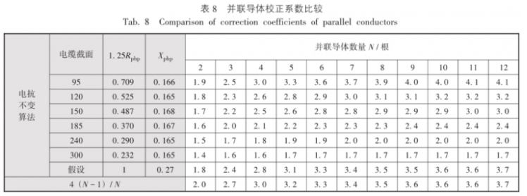 常规的电路并联阻抗计算,并没有电阻变、电抗不变的说法。但电抗值和导体排布有关,从表8看,95 mm2截面电缆的电抗和300 mm2截面电缆的电抗是基本一致的,如果采用4根195 mm2截面电缆成束代替1根1300 mm2电缆这种方式,这时回路电抗基本是不变的。所以,电抗不变算法更适用于每相电缆成束的情况,而不适用于常用的多芯电缆并列的情况,而文献[1]每相中有多根并联导线更准确的理解是每相多根电缆成束。